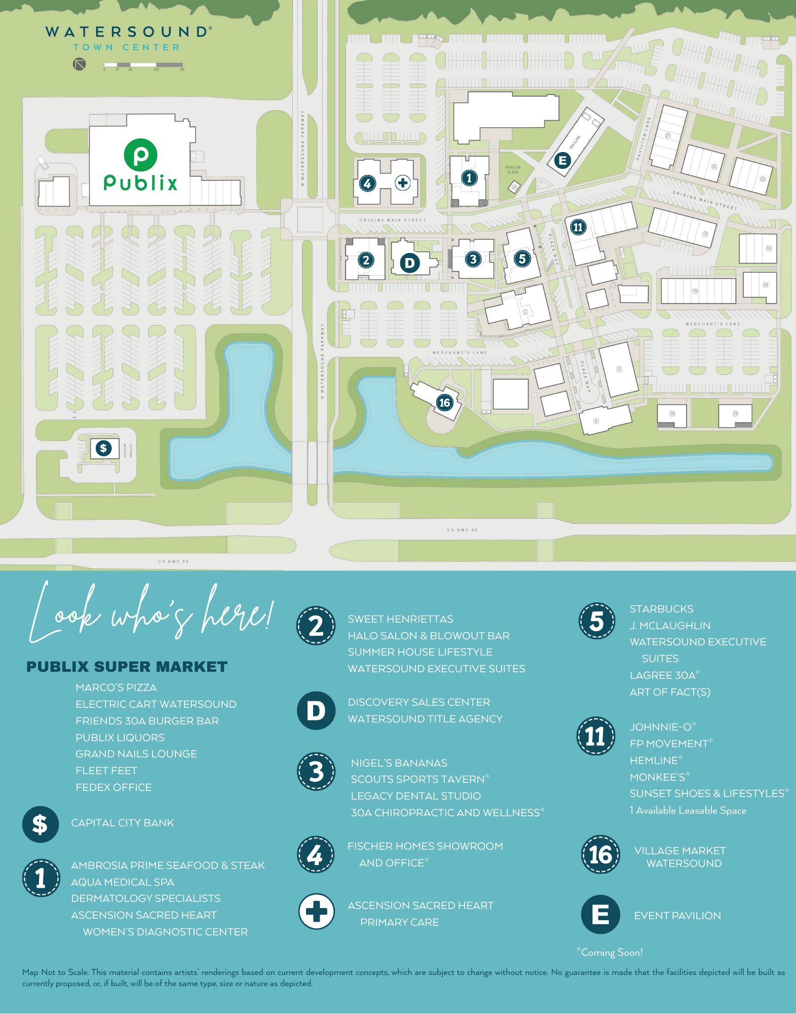 Fronting US Highway 98 in at the entrance to the Watersound Origins community, Watersound Town Center is just minutes from the famed Scenic Highway 30A corridor and the iconic beach towns of Rosemary Beach, Alys Beach and Seaside. The center is within reach of the neighboring beach towns of Destin and Panama City Beach.