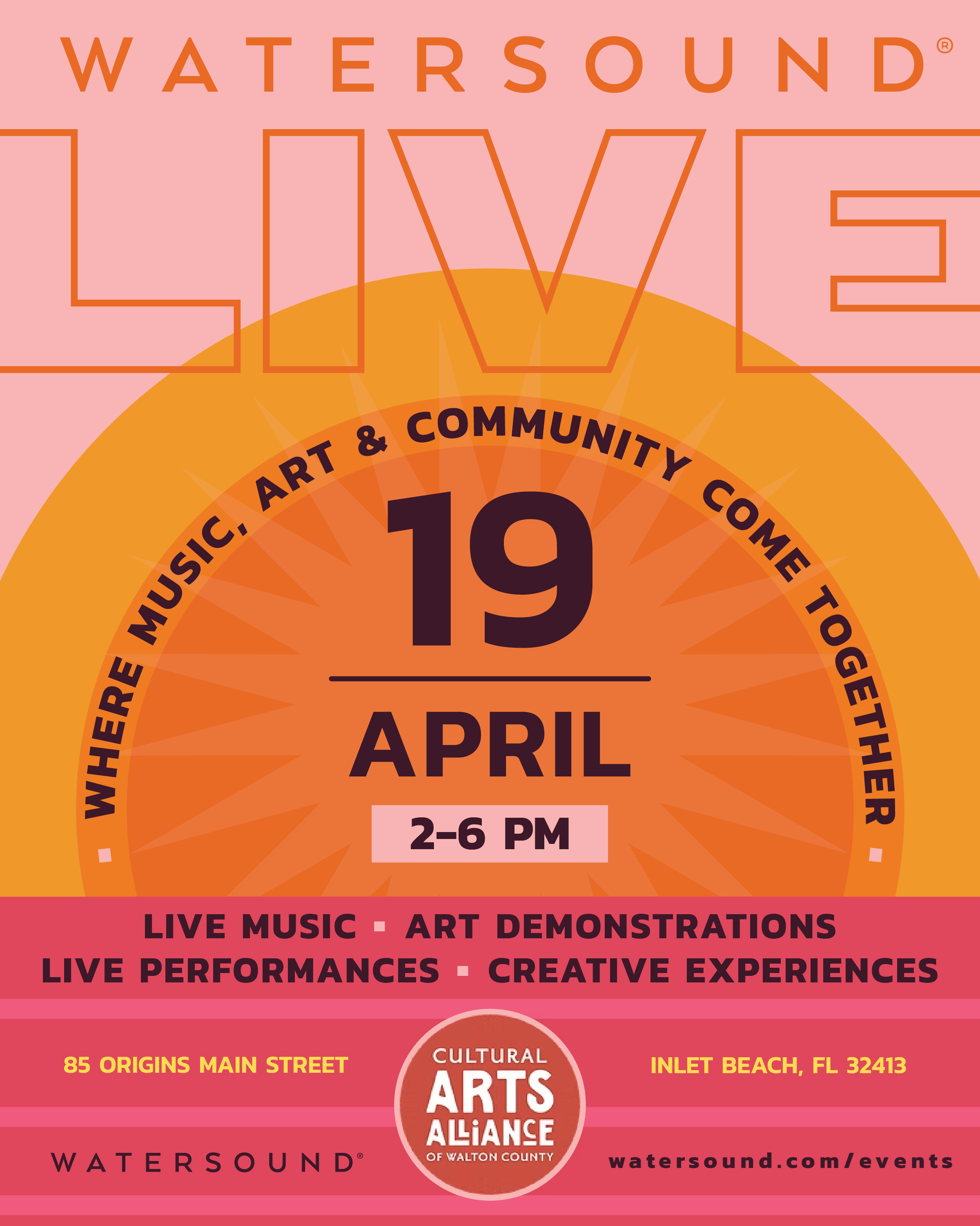 Join us for a free, family friendly afternoon where creativity comes to life all around you. Watersound LIVE is an immersive celebration of music, art, movement, and more featuring live performances and demonstrations happening throughout The Pavilion at Watersound Town Center. Stroll through the event, meet talented artists, and watch creativity unfold in real time. With interactive moments and entertainment for all ages, Watersound LIVE is designed to bring the community together for an unforgettable afternoon. Bring your family, invite your friends, and come experience the energy of Watersound LIVE.